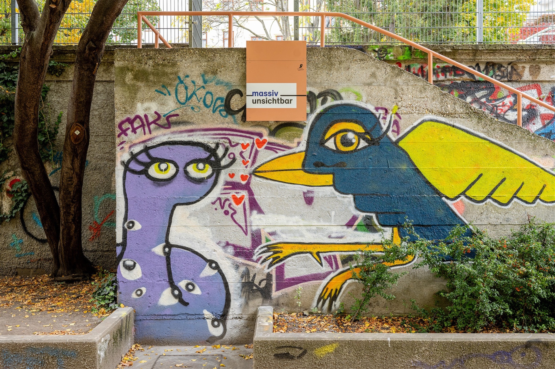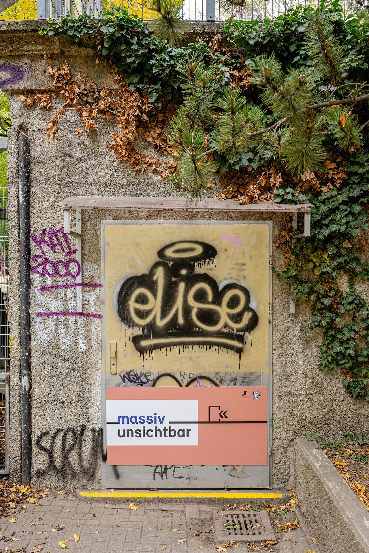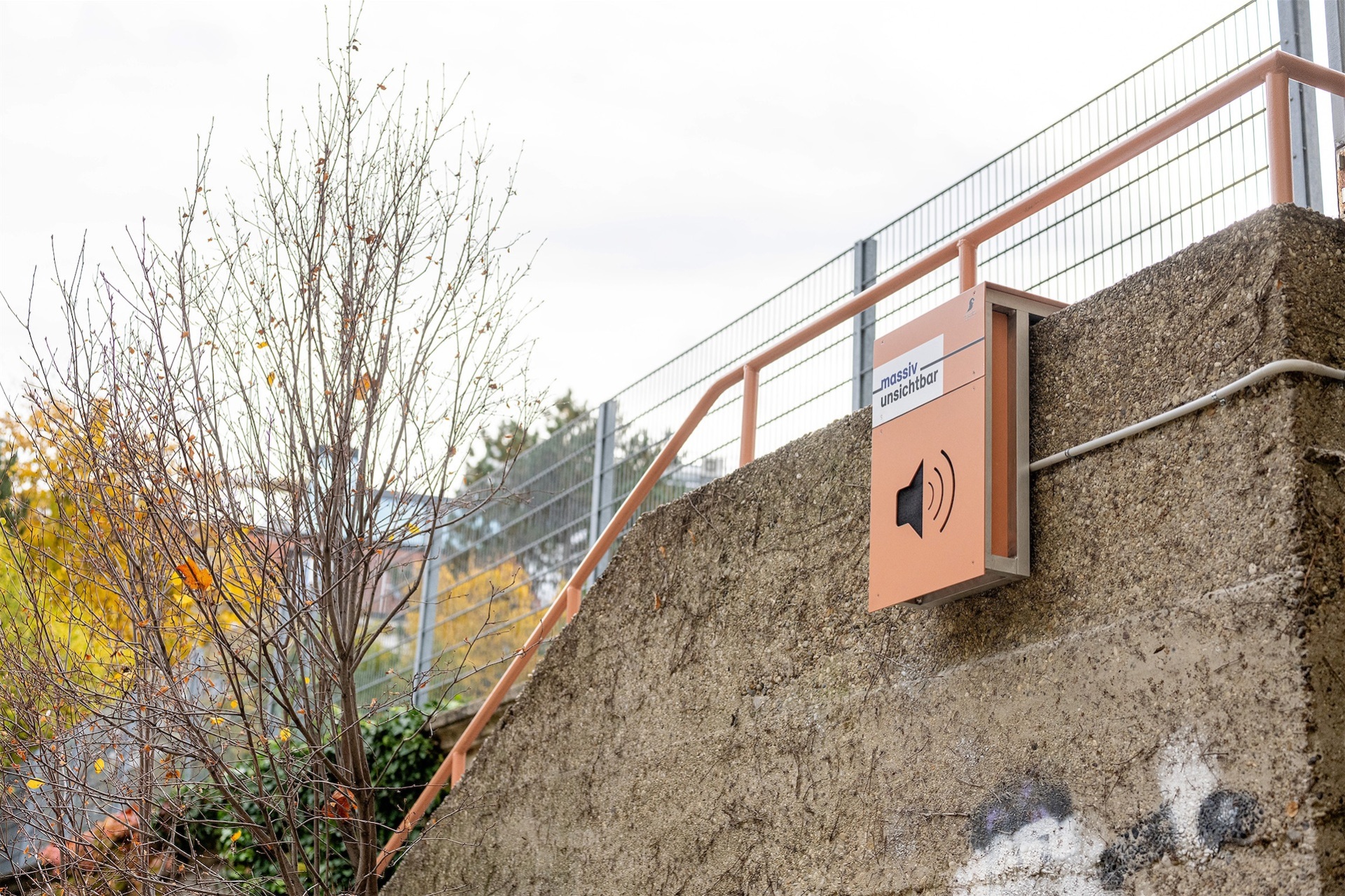 Die zuerst in Betracht gezogene Gedenktafel wurde von uns schnell verworfen und das Konzept eines umfassenderen Erinnerungs- und Awareness-Projekts nahm Gestalt an. Es konzentriert sich auf die beiden von uns als wesentlich ausgemachten Merkmale: Das Gebäude ist sehr massiv, eigentlich unzerstörbar aus Stahlbeton gebaut. Und trotzdem wird es beinahe nicht wahrgenommen. Es ist mehr oder weniger unsichtbar (Abb. 1).