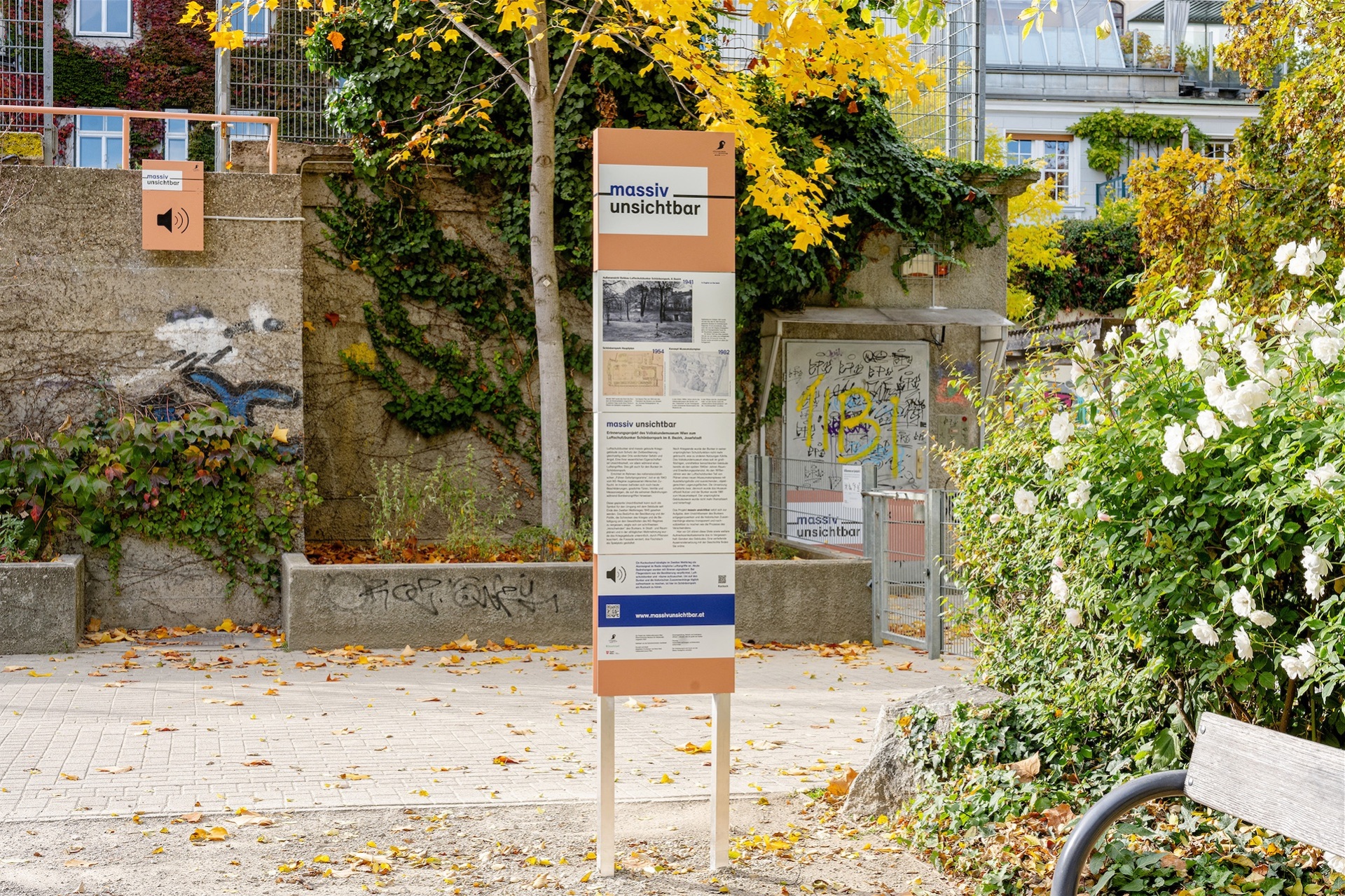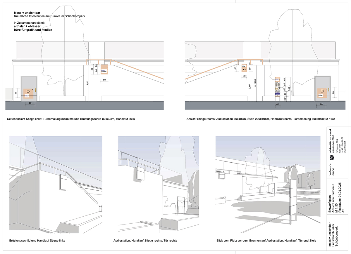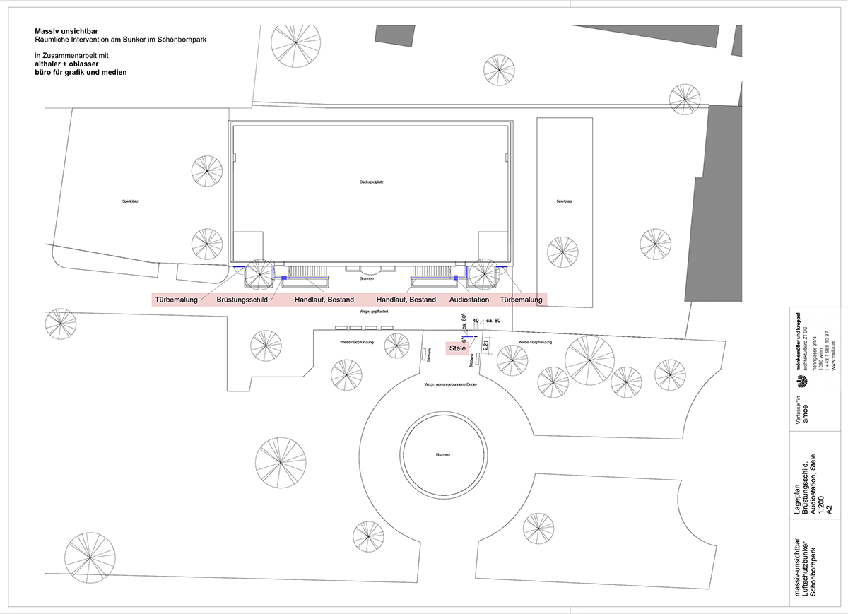 massiv unsichtbar stellt sich die Aufgabe, das Gebäude in seiner baulichen und seiner geschichtlichen Dimension sowie in seiner Gegenwartswirksamkeit und seinen Zukunftsmöglichkeiten (wieder) sichtbar zu machen. Ersteres durch die visuelle wie akustische Dauerintervention (Abb. 5 bis 12) vor und am Bunker im Schönbornpark; und Zweiteres vor allem durch diese Projektwebseite, auf der wir in vier Kapiteln die Biographie dieses Gebäudes und seiner Umgebung nachzeichnen.