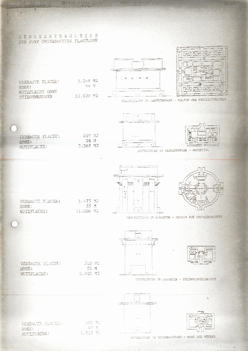 Seit Ende der 1950er gab es immer wieder öffentlich diskutierte Pläne (Abb. 1) zur Nutzung der Turmpaare im Augarten (2. Bezirk) und im Arenbergpark (3. Bezirk).10 Der Geschützturm im Arenbergpark wird seit 1991 als Museumsdepot verwendet, zuerst von den Bundesmuseen gemeinsam11 und seit 1995 vom Museum für Angewandte Kunst (MAK).12 Auch das Volkskundemuseum Wien lagerte dort zwischen 1991 und 1993 Objekte ein.13 Dass Kriegs- und Schutzbauten in Wien als Depot für Kunst- und Kulturgüter herangezogen werden, ist also keine Ausnahme. Neben dem Volkskundemuseum Wien (VKM) und dem MAK nutzt auch die Österreichische Galerie Belvedere einen solchen Bau – den unter der Parkanlage gelegenen Tiefbunker – als Objektdepot.14 Der Bunker im Schönbornpark wurde vor der Nutzung durch das VKM zwischen 1947 und 1978 von Magistratsabteilungen der Stadt Wien als Lager für Archivalien und Büchern verwendet.15