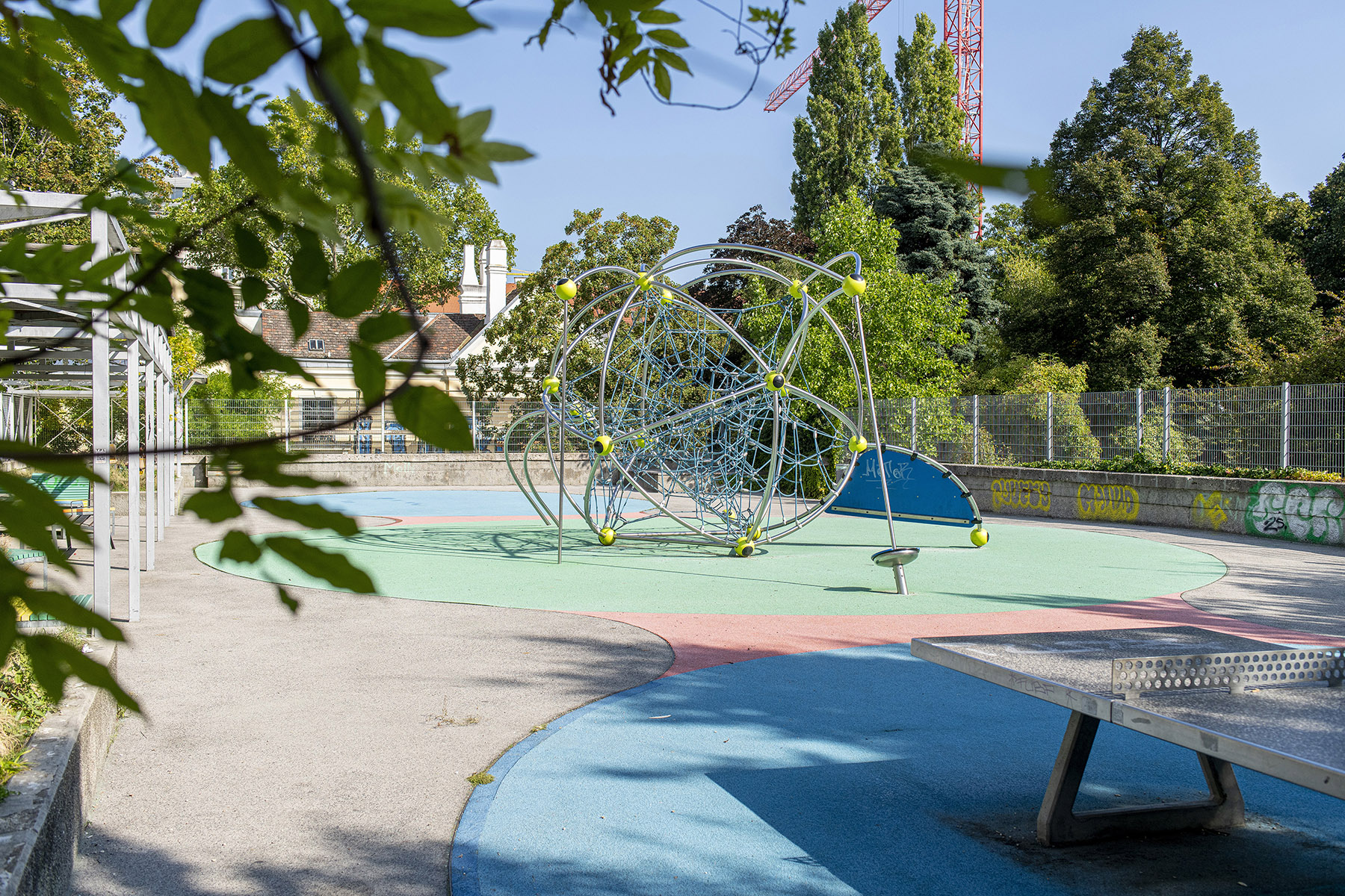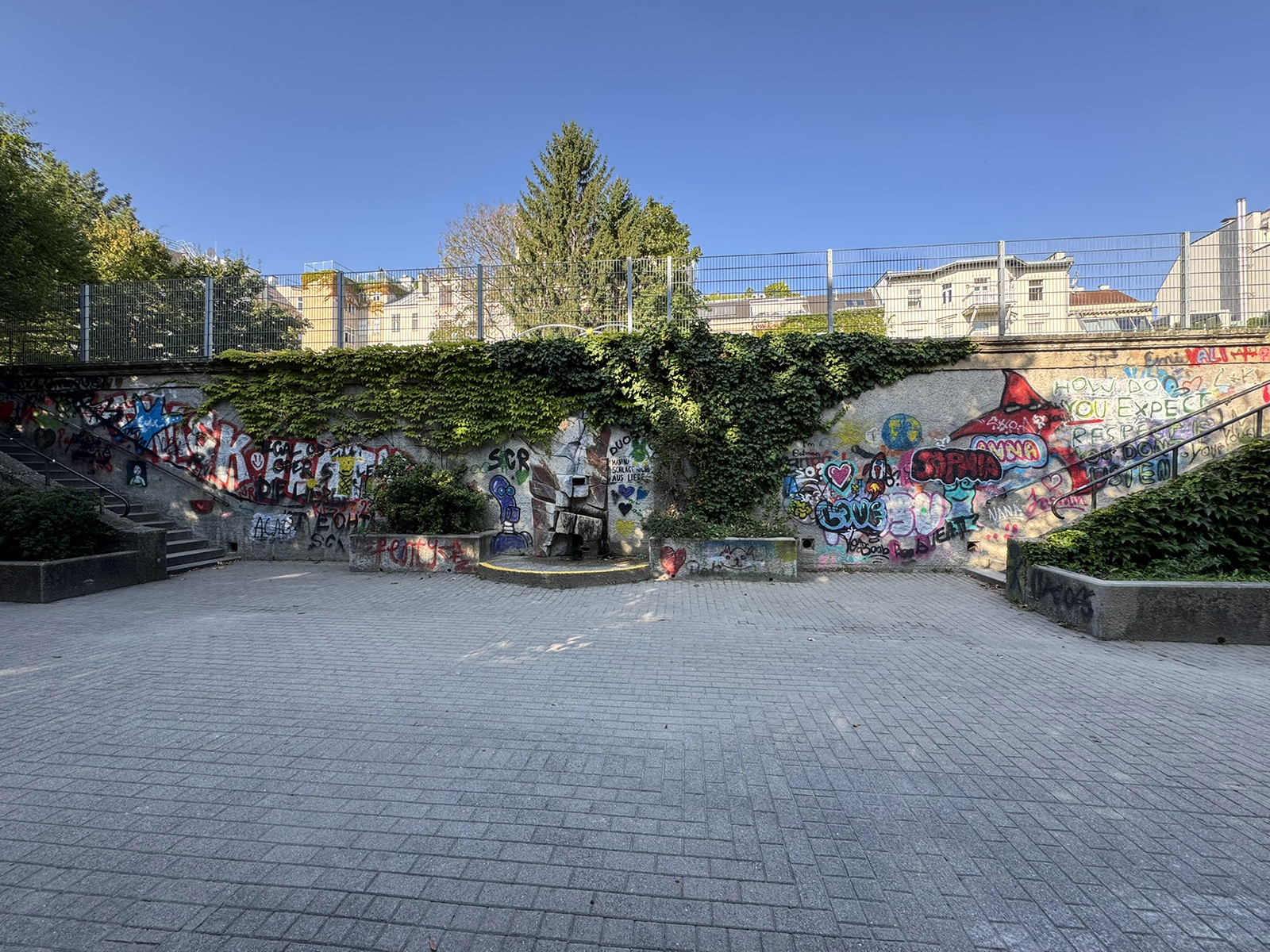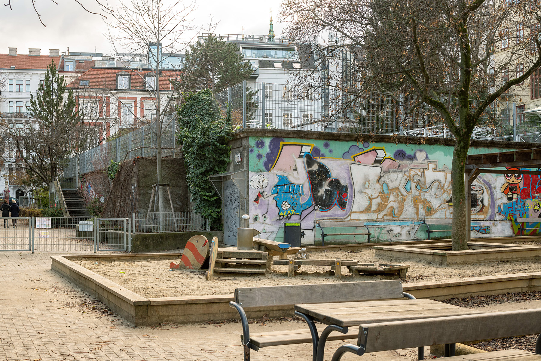 Durch die andauernde Bezeichnung als Terrasse und Spielplatz in offiziellen Plänen der Parkanlage sowie die kleinen Eingriffe an der und um die Fassade verschwand der Luftschutzbunker immer mehr und fügte sich beinahe bruchlos in die Parklandschaft ein. Heute ist er neben Bewuchs und Trinkbrunnenmosaik außerdem mit Graffitis überzogen (Abb. 11 und 12). Das Flachdach wird auch aktuell als Spielplatz genutzt (Abb. 13).