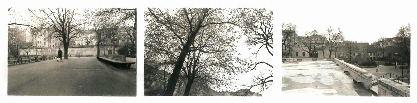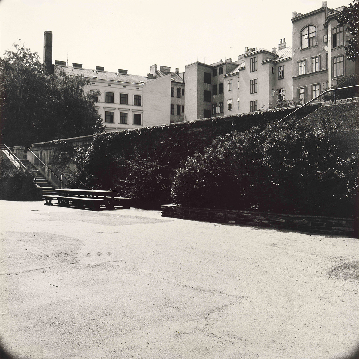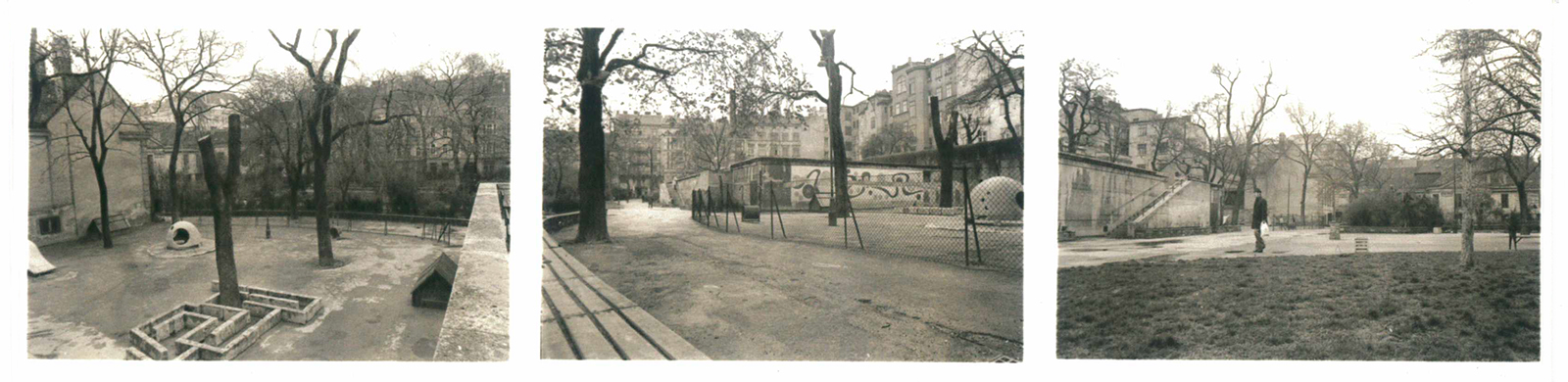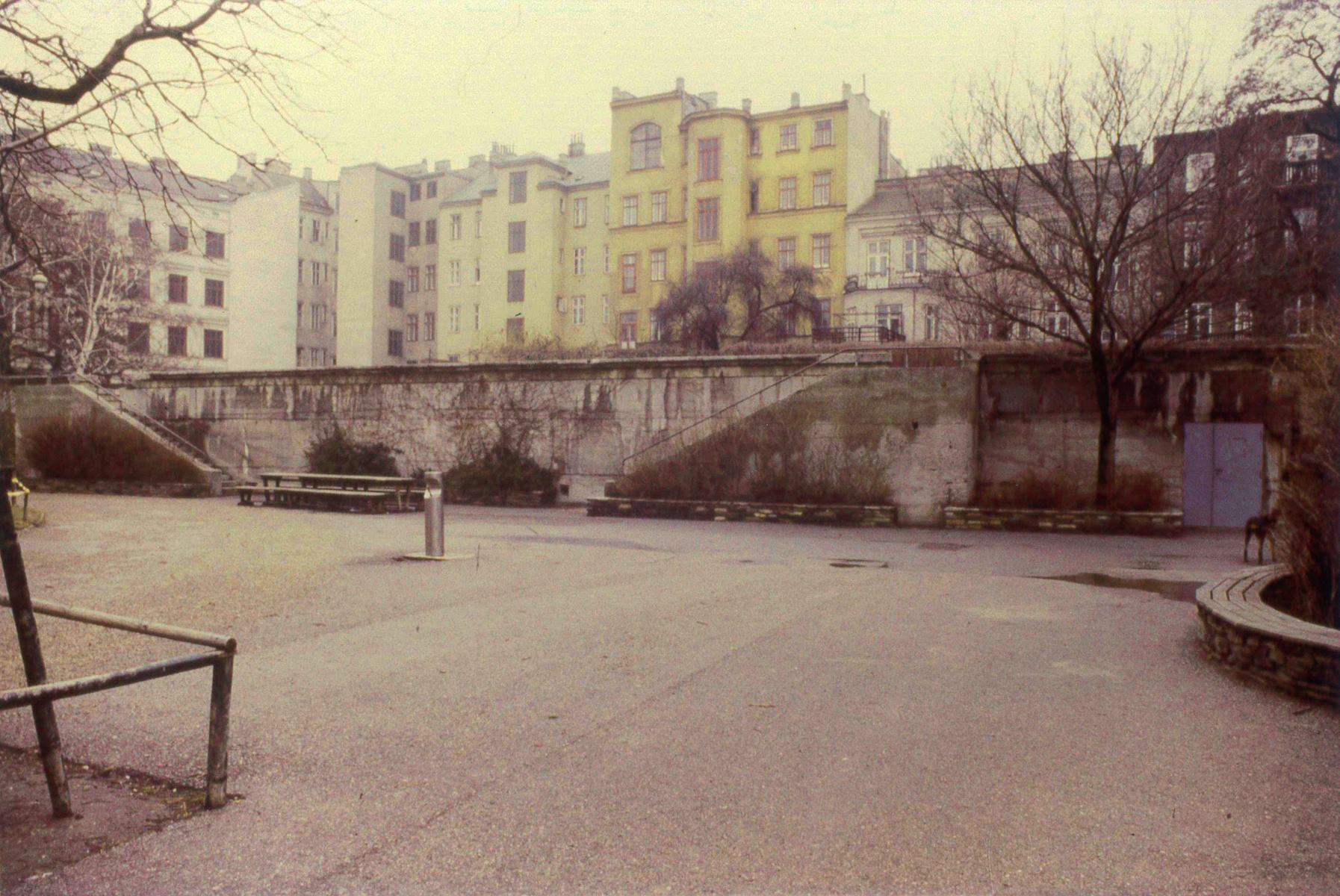 21 Jahre später – im Hauptplan von 197320 (Abb. 4) – wird die Fläche auch als „Terrasse Kinderspielplatz“ betitelt. Die 16 Bänke und die zwei Sandkisten sind noch eingezeichnet. Vor, neben und zwischen den Stiegen wurden großflächige gemauerte Pflanzbeete angelegt (Abb. 5, 6 und 7), die es bis heute noch gibt. Die Außenmauern dürften Anfang der 1970er Jahre nicht (mehr) vollständig begrünt gewesen sein. Nach 1973 wurden die Außenmauern verputzt, 1978 präsentierte sich der Bunker kahl und weitgehend trostlos (Abb. 8 und Abb. 9).21