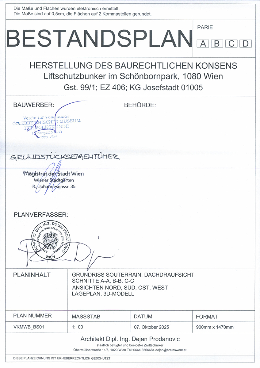 All dies wurde erst 2025 möglich. Der Bestandsplan für den Bunker ist gezeichnet und abgegeben, der sogenannte baurechtliche Konsens hergestellt. Der Bunker ist über 80 Jahre nach seiner faktischen Erbauung nun auch behördlich genehmigt errichtet und somit ausbaufähig. Die Zukunft hat begonnen.