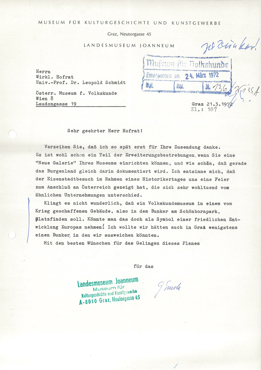- Schreiben G. Smola Landesmuseum Joanneum an Leopold Schmidt, 24. März 1972, 1 Seite; Ordner Bunker 1969, Archiv Volkskundemuseum Wien.