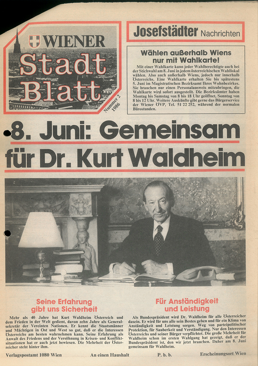 Nur am Rande sei erwähnt, dass der für die Pressekonferenz im Museum als Unterstützer des Aufbauprojektes angekündigte Wissenschaftsminister Heinz Fischer wegen „der aktuellen innenpolitischen Vorgänge“ nicht teilnahm. Das Jahr 1986 war allgemein von den Vorkommnissen und Richtungsentscheidungen rund um die Wahl von Kurt Waldheim (1918–2007) zum österreichischen Bundespräsidenten geprägt („Waldheimaffäre“). Waldheim stellte sich als ehemaliger UNO-Generalsekretär als Garant für den Frieden und Wahrer österreichischer Interessen dar (Abb. 10), was in der österreichischen Öffentlichkeit nicht (mehr) ohne Widerspruch hingenommen wurde. Vielmehr lösten Waldheims Kriegs- und NS-Vergangenheit heftige politische Diskussionen rund um die Verbrechen und die österreichische Beteiligung am NS-System aus. Dass er trotzdem zum Bundespräsidenten gewählt wurde, war auch für ein Umdenken in der österreichischen Geschichts- und Erinnerungspolitik bedeutend. Ebenfalls entscheidend für eine politische und ideologische Wende war sicher auch der „Putsch“ Jörg Haiders an die Spitze der FPÖ am 13. September 1986. Dieser Rechtsruck der FPÖ war Anlass für Bundeskanzler Franz Vranitzky, die kleine Koalition aus SPÖ und FPÖ zu beenden. Damit begann der Aufstieg der FPÖ zur heute stimmenstärksten Partei in Österreich.
