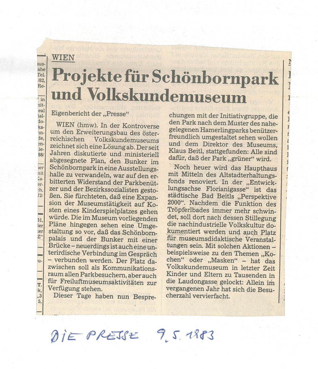 - Vgl. Peter Zehrer: Josefstädter Bunkerkrieg. Das Museum für Volkskunde kämpft um seinen Lebensraum. Die Presse, 8. September 1986, S. 3.