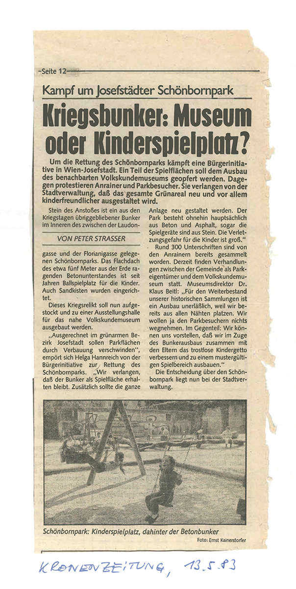Wie sich bald zeigte, wurde das für die umfassenden Ausbaupläne des Volkskundemuseum Wien (VKM) zum Problem – war doch im Februar 1983 noch geplant, dass neben der Fassaden-Restaurierung am Palais Schönborn auch der Luftschutzbunker Schönbornpark und das „Tröpferlbad“ in der Florianigasse als Teile eines neuen Museumskomplexes adaptiert werden (vgl. Kapitel 3 „Pläne und Modelle“). Nach dem Wahltermin nahmen die Ansprüche an die Parkgestaltung allerdings neue Dynamiken auf, wie sich in einigen Zeitungsberichten vom Mai 1983 nachlesen lässt. Während der damalige Museumsdirektor Klaus Beitl (*1929) in der Zeitung Die Presse von einer „Perspektive 2000“ und den großen Plänen berichtete (Abb. 1), wurde in der Kronenzeitung kurz darauf ein in diesem Zusammenhang überraschend martialischer „Kampf um Josefstädter Schönbornpark“ ausgerufen, dessen „Stein des Anstoßes“ ausgerechnet der Luftschutzbunker war. Der „grünarme Bezirk Josefstadt“ sollte, so Vertreter*innen der „Bürgerinitiative zur Rettung des Schönbornparks“, nicht dem Ausbau des VKM „geopfert“ und der Bunker als Kinderspielplatz erhalten werden (Abb. 2).