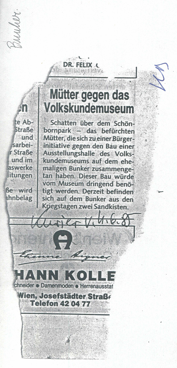 Wie sich das Geschehen ab Frühjahr 1985 genau zugetragen hat, lässt sich aus den im Archiv des VKM liegenden Materialien nicht mehr ganz genau rekonstruieren. Es scheint aber so, als hätten hier zumindest zwei Prozesse stattgefunden: Zum einen treibt das VKM seine Pläne voran und stellte in Dienstbesprechungen mit den zuständigen Stellen der Stadt und des Ministeriums6 nicht nur die Adaptierung des Museumsgebäudes in der Laudongasse vor, sondern präsentierte in diesem Zusammenhang auch die Pläne für die „Bunkeraufstockung“. Zum anderen dürften diese Projektpläne, die Ende Mai 1985 dem Bezirkspräsidium und „den Mandataren der politischen Parteien“ gezeigt worden waren, den Weg in die Öffentlichkeit gefunden haben. Medien berichteten über den im Bezirk sehr offensiv vorgebrachten Widerstand gegen diese Bauvorhaben. In den Schlagzeilen der Bezirks- und anderer Zeitungen zeigten sich nun die vorher erwähnten neuen Thematiken und Interessensgruppen, die beispielsweise „Grün statt Beton“, „Grün statt Kultur“, „Grün und Kultur“ oder nicht zuletzt „Mütter gegen Museum“ (Abb. 6) lauteten.