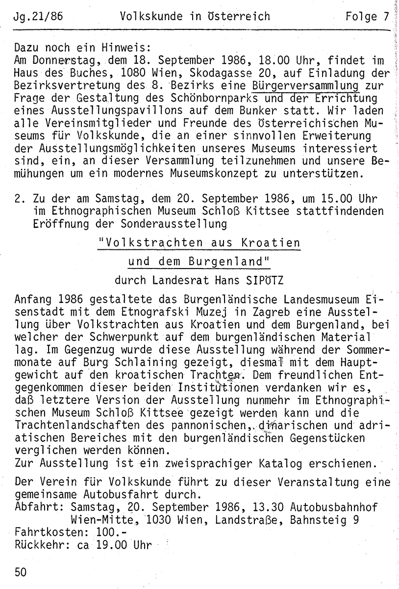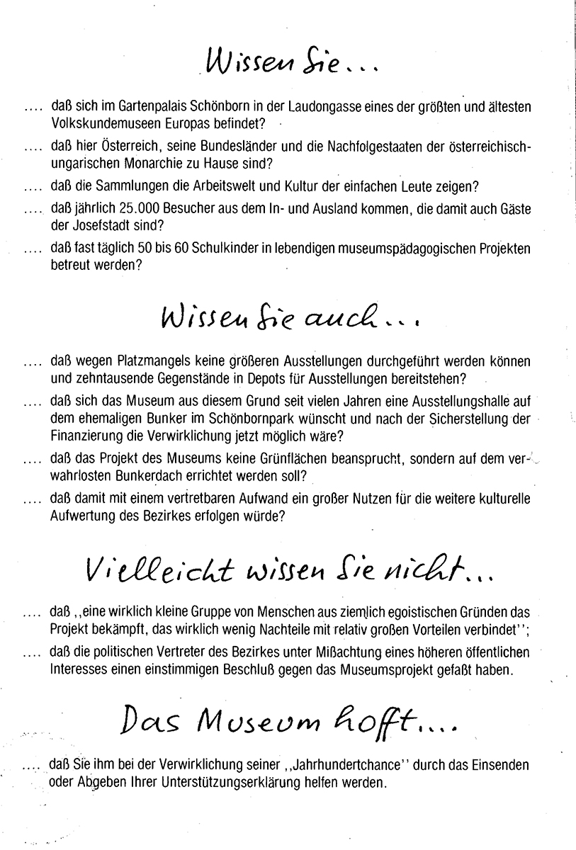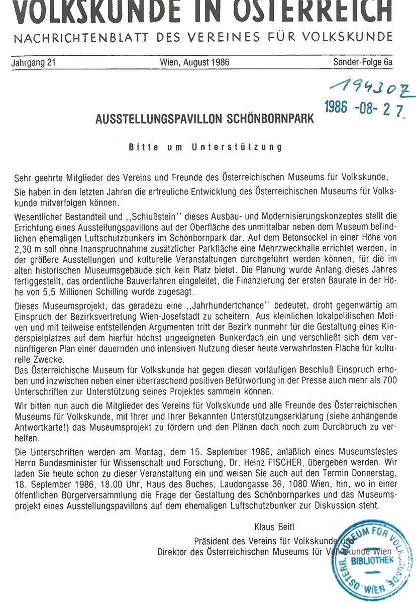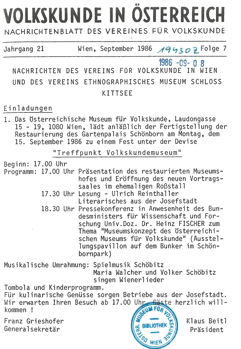 Zu einem letzten Aufbäumen seitens des VKM kam es im September 1986. Das Museum und sein damaliger Direktor Klaus Beitl wollten – unterstützt von Teilen der Presse und Politik, z. B. durch den damaligen Wissenschaftsminister Heinz Fischer (*1938) oder den „Mitteleuropa-Aktivisten“ Erhard Busek (1941–2022)11 – die großen Pläne für ein erweitertes und auf den neuesten Stand gehobenes Volkskundemuseum, auch gegen den Widerstand des Bezirkes, nicht aufgeben. Das Museum startete eine Flugschriftenaktion im Bezirk und bat auch Kolleg*innen aus „Fachkreisen“ um Unterstützung und Stellungnahmen. Darüber hinaus nützte man die Fertigstellung der Restaurierarbeiten des Innenhofes und des neuen Vortragssaales im Museumsgebäude in der Laudongasse für ein Fest und eine „Bürgerdiskussion“ mit dem Titel „Treffpunkt Volkskundemuseum“ am 15. September, um noch einmal auf das Thema aufmerksam zu machen. Neben einer Lesung und Liedvorträgen kam es auch zu einer Pressekonferenz über „Museumskonzepte des Österreichischen Museums für Volkskunde“. Darüber hinaus hatte man sich auf unterschiedlichen Kanälen an die „Mitglieder des Vereins und Freunde des Museums“ gewandt, um den Sachverhalt darzulegen und die „Jahrhundertchance“ Bunkeraufbau für das Museum hervorzuheben.12 (Abb. 9)