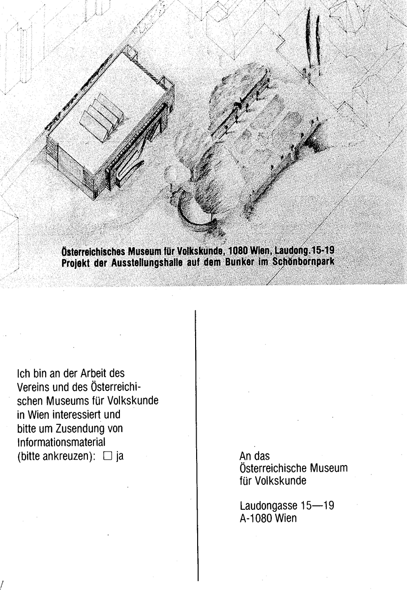- In einem Dokument im Archiv hat das VKM (wsl. Klaus Beitl) eine „Chronologie der Ereignisse aus der Sicht des Österreichischen Museums für Volkskunde in Wien“ ab 1983 erstellt. Hier ist zu lesen, dass es am 26. März 1985 eine Dienstbesprechung mit dem Bundesministerium für Wissenschaft und Forschung, der Magistratsdirektion, den MA 25, 26, 42 und 52 sowie dem Bundesdenkmalamt und der Bezirksvorstehung gegeben hat. Ordner Ausstellungshalle Bunker 1982-1987.