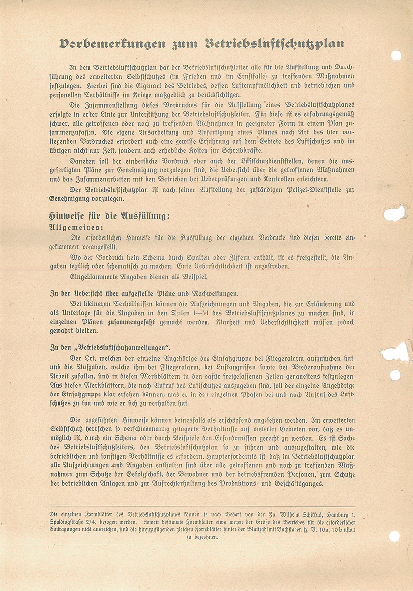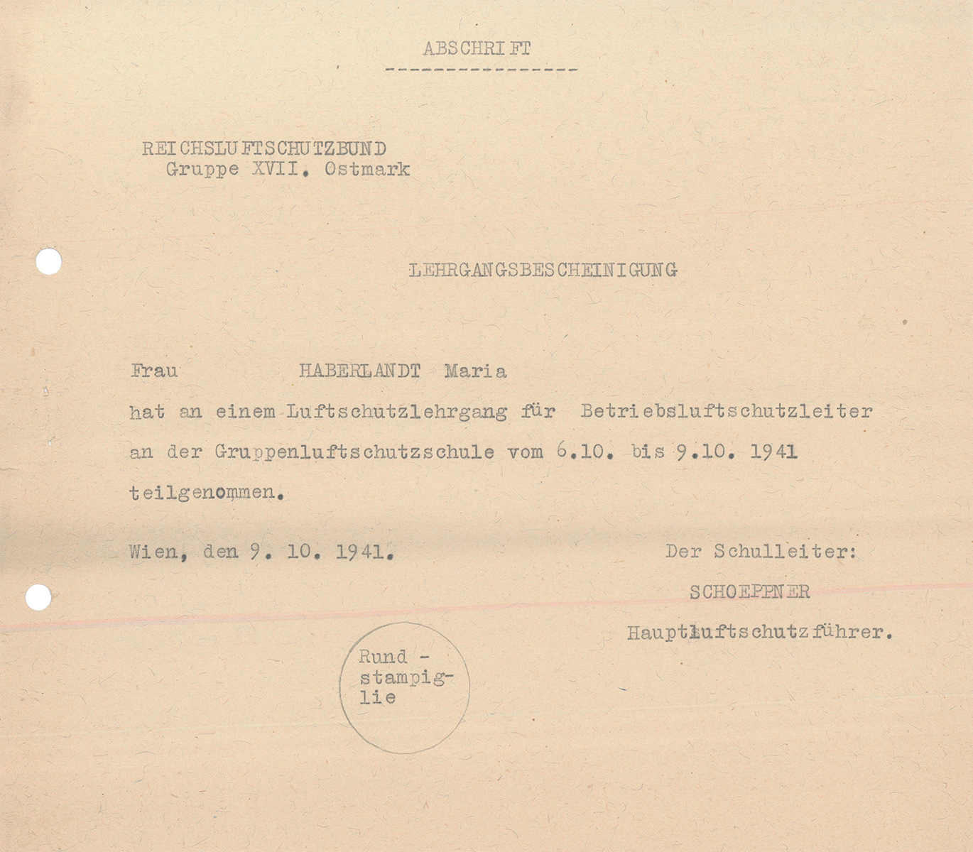 Im Volkskundemuseum Wien (VKM) wurde im August 1939 der vorgedruckte „Betriebs-Luftschutzplan“ (Abb. 1) gemäß „erweitertem Selbstschutz im Luftschutz“ (Abb. 2) ausgefüllt. Der damalige, regimefreundliche Museumsdirektor Arthur Haberlandt (1889–1964) gab sich zunächst selbst als „Betriebsluftschutzleiter“ an. Der Betriebsluftschutzleitung unterstanden eine Stellvertretung und weitere Hilfskräfte aus dem Museumsteam. Sie alle mussten nachweislich spezifische Luft- und Brandschutzschulungen absolvieren (Abb. 3). Im Fall eines Luftangriffs waren von diesen geschulten Angestellten Aufgaben nach einem vorgefertigten Ablauf zu erledigen (Abb. 4).