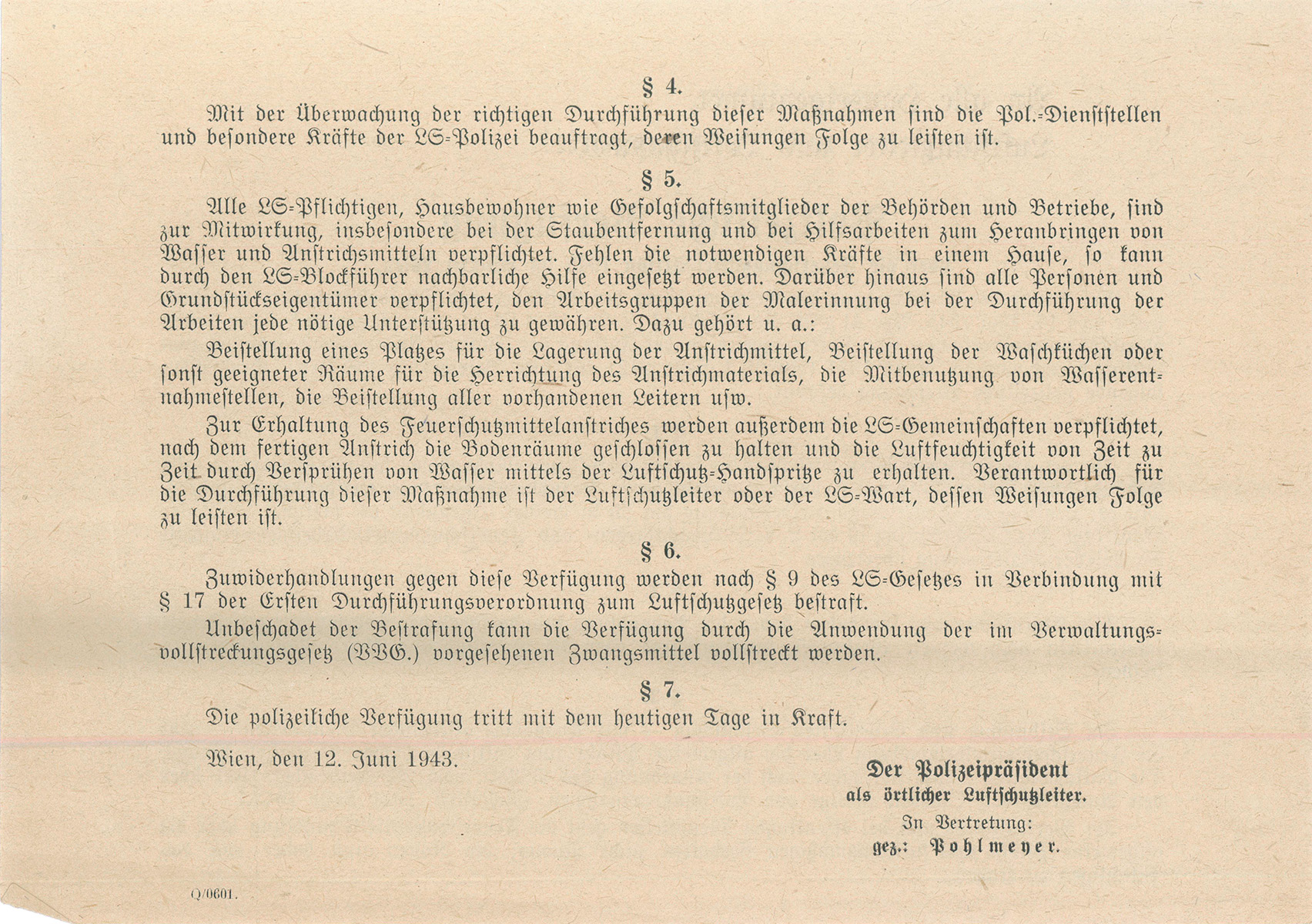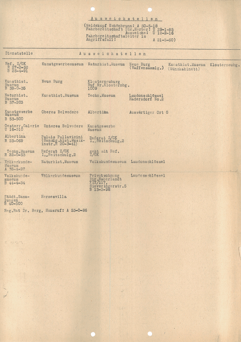 Ab Mai 1943 wurden die Museumsangestellten durch ein siebenköpfiges „Wehrmachtshilfskommando“ unterstützt, welches nachts die Brandwache übernahm.4 Im Notfall gab es zudem eine Unterstützungserklärung der nahegelegenen Gaudienststelle der NS-Organisation „Kraft durch Freude“ in der Laudongasse 16 (8. Bezirk) sowie die Möglichkeit, Hilfe bei der in der Nähe gelegenen Polizeidienststelle anzufordern.5 Diese Dienststelle in der Fuhrmanngasse 8 (8. Bezirk) war in Sachen Luftschutz für das Museum zuständig. Sie genehmigte den „Betriebs-Luftschutzplan“ und ordnete Luftschutzübungen an.6