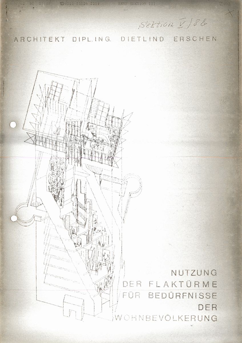 Eine andere Nutzungsvariante für die Bunker war, dass diese Gebäude als Fundamente für Neubauten dienten bzw. dienen sollten (vgl. Kapitel 3. „Wem gehört der Bunker?“). Zwischen 1958 und 1962 gab es Entwürfe, die vorsahen, dass fünf der sechs Wiener Flak-Türme als Sockel in Hochhäuser integriert werden sollten.16 Das Gebäude der Volkshochschule Favoriten am Arthaberplatz (10. Bezirk) wurde 1961 schließlich auf dem dortigen Tiefbunker errichtet.17