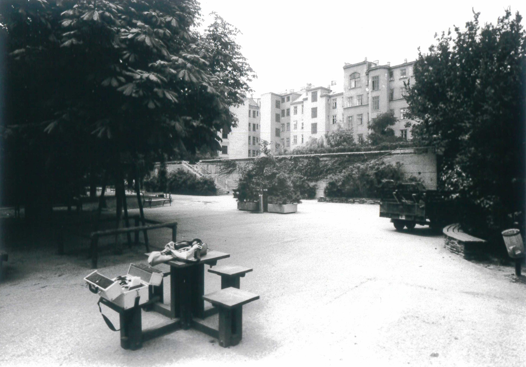 21 Jahre später – im Hauptplan von 197320 (Abb. 4) – wird die Fläche auch als „Terrasse Kinderspielplatz“ betitelt. Die 16 Bänke und die zwei Sandkisten sind noch eingezeichnet. Vor, neben und zwischen den Stiegen wurden großflächige gemauerte Pflanzbeete angelegt (Abb. 5, 6 und 7), die es bis heute noch gibt. Die Außenmauern dürften Anfang der 1970er Jahre nicht (mehr) vollständig begrünt gewesen sein. Nach 1973 wurden die Außenmauern verputzt, 1978 präsentierte sich der Bunker kahl und weitgehend trostlos (Abb. 8 und Abb. 9).21