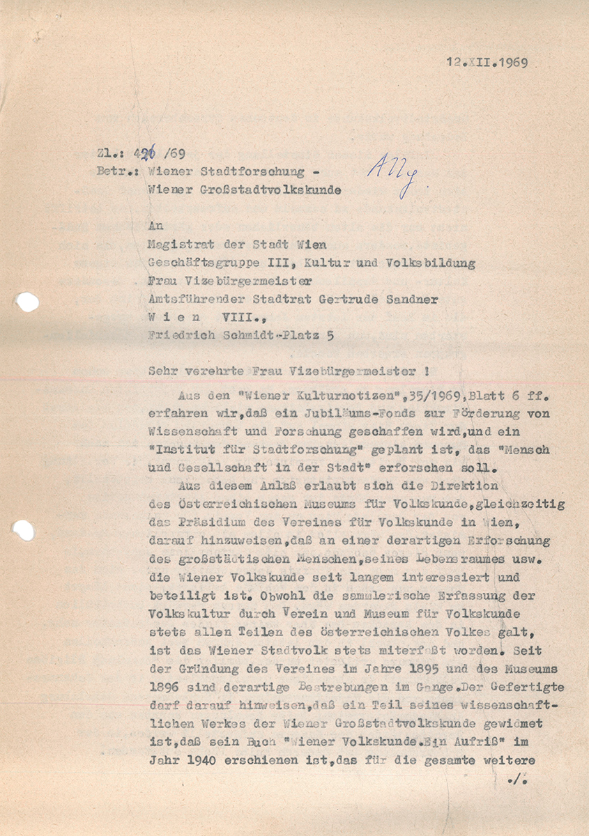 - Schreiben Leopold Schmidt an Magistrat der Stadt Wien, Geschäftsgruppe III, Kultur und Volksbildung, VBM Sandner: „Betr. Wiener Stadtforschung – Wiener Großstadtvolkskunde“, 4 Seiten; Ordner Bunker 1969, Archiv Volkskundemuseum Wien.