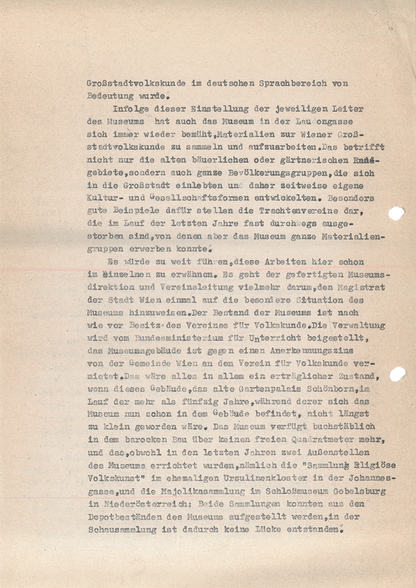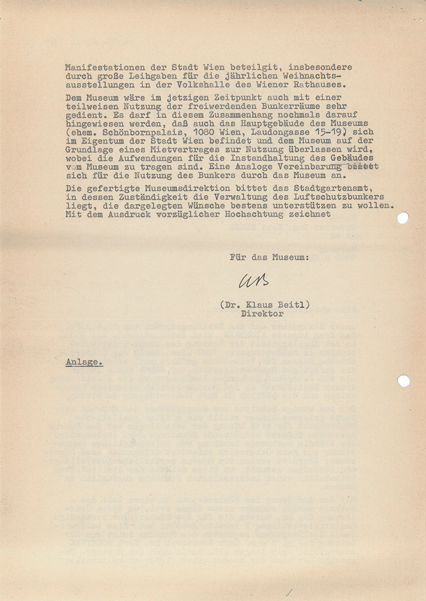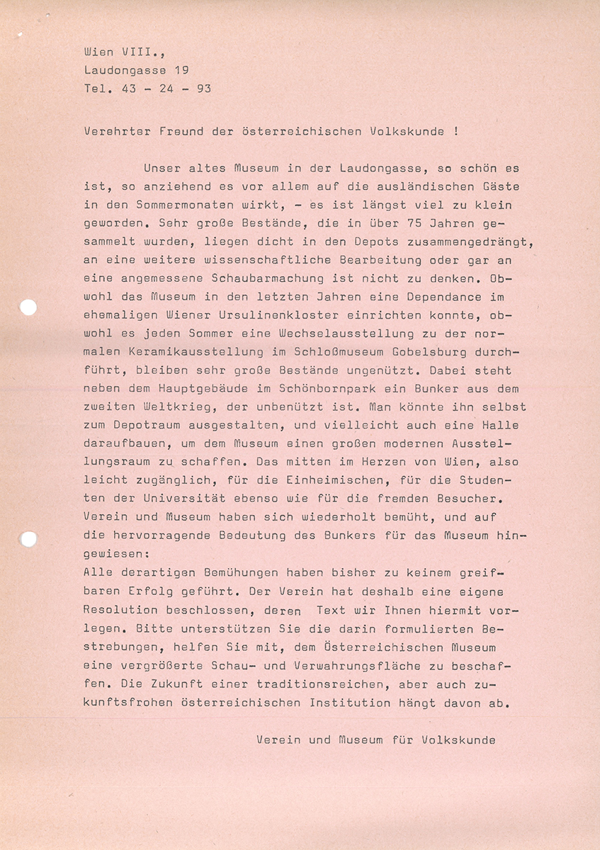 - Schreiben ÖMV an BM für Wissenschaft und Forschung: „Resolution über Erweiterung“, 26. März 1971, 3 Seiten; Ordner Bunker 1969, Archiv Volkskundemuseum Wien.
