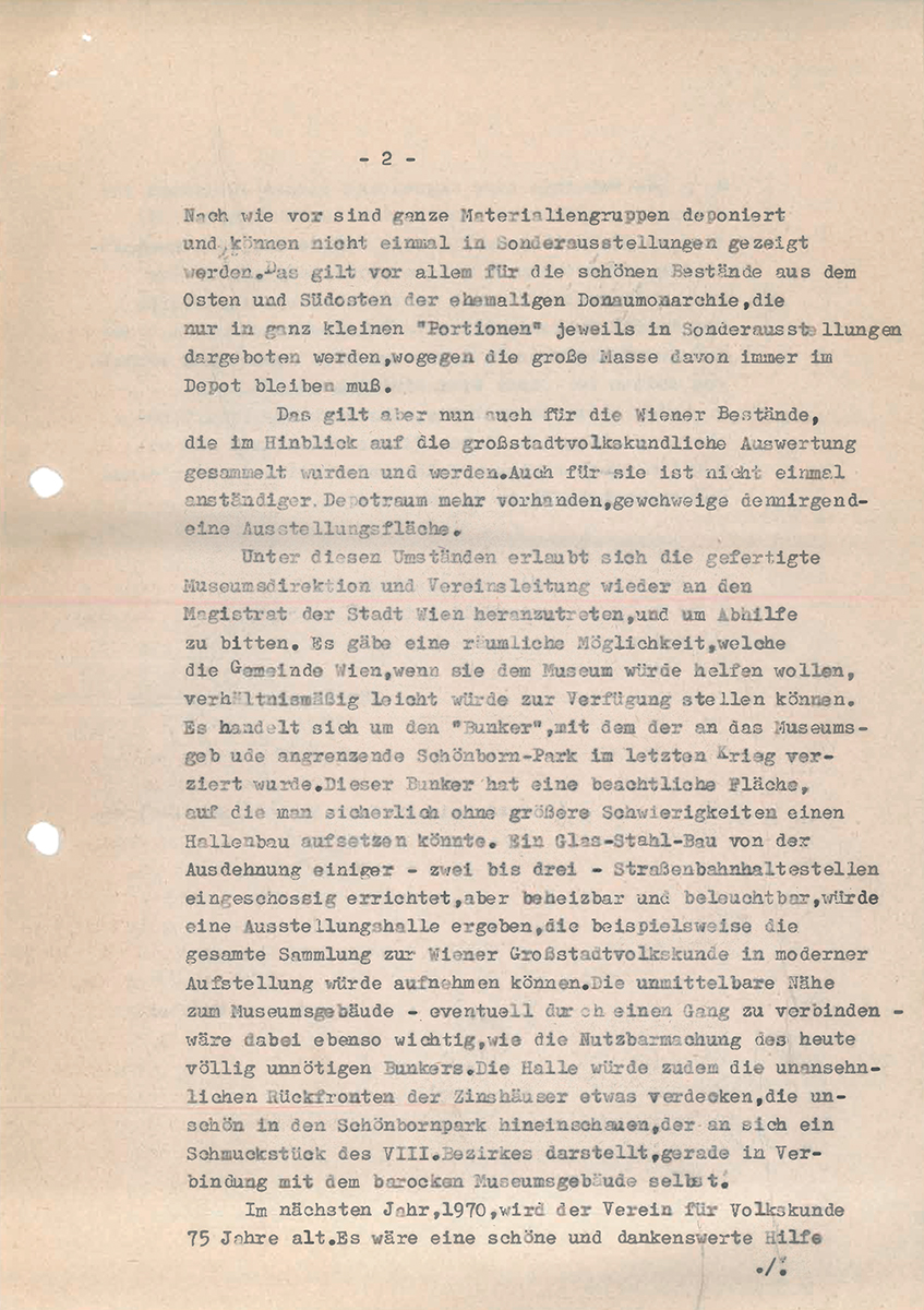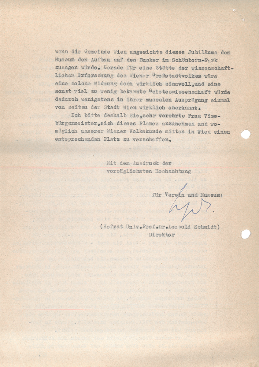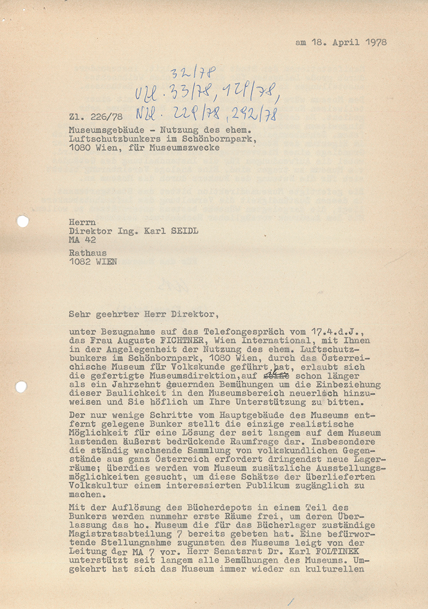 - Schreiben Abteilungsleiter Foltinek (MA 7) an ÖMV und Leopold Schmidt, 2. Juni 1970, 1 Seite; Ordner Bunker 1969, Archiv Volkskundemuseum Wien.