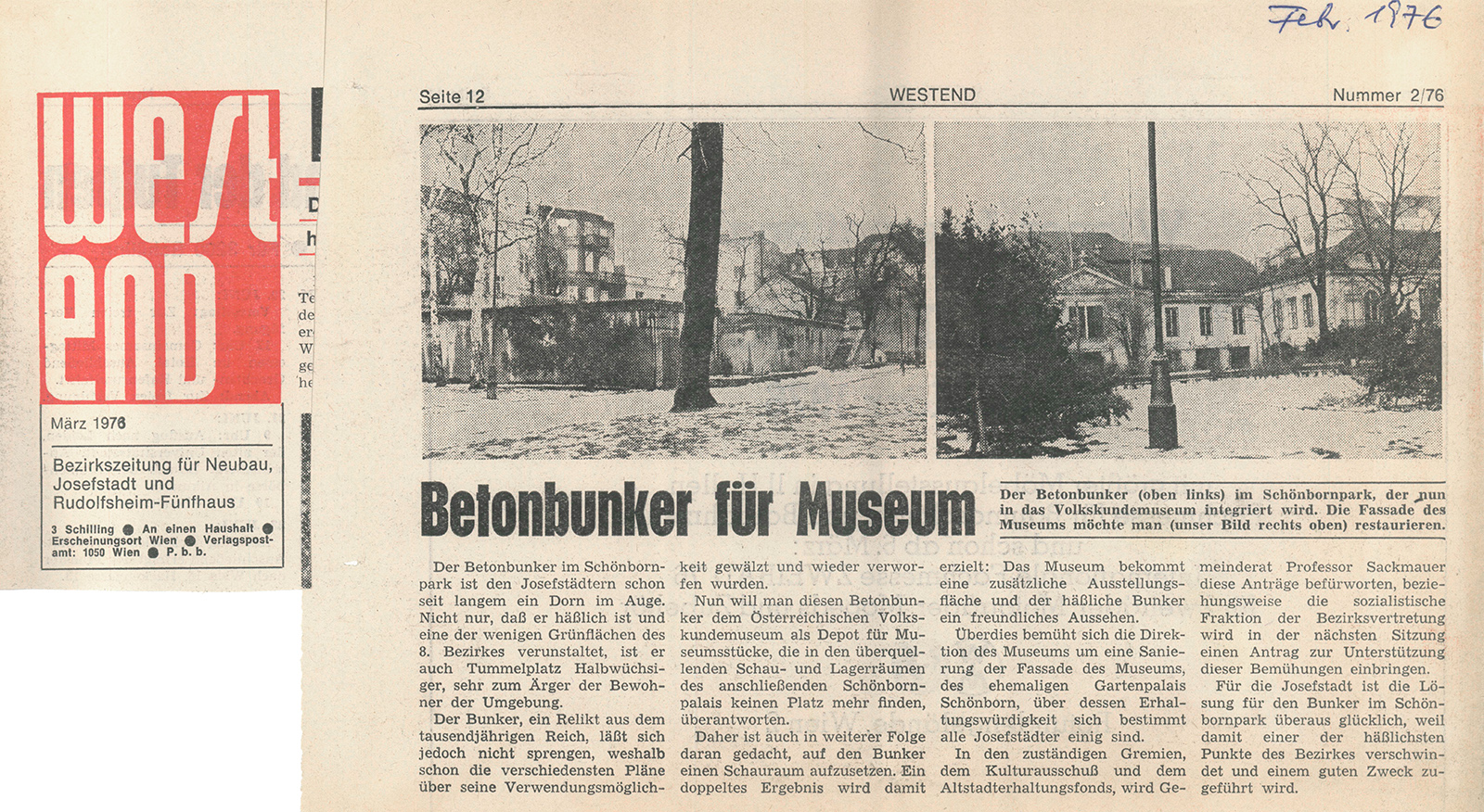 - N. N.: Betonbunker für Museum. In: westend. Bezirkszeitung für Neubau, Josefstadt und Rudolfsheim-Fünfhaus. 2/76, S. 12; Ordner Presse MusfVK Bunker, Archiv Volkskundemuseum Wien.