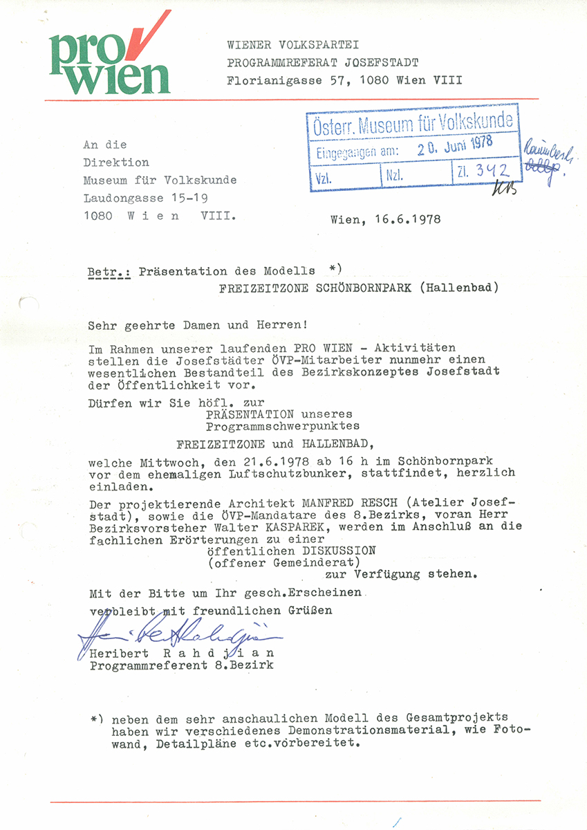 Auch wenn in den Archivalien des Museums nicht allzu viel über den weiteren Verlauf zu finden ist, so scheint doch ab Mitte der 1970er Jahre eine Veränderung stattgefunden zu haben. In einem Beitrag in der Bezirkszeitung „westend“ erschien ein Beitrag unter dem Titel „Betonbunker für Museum“8, der nicht nur auf den schlechten Zustand des Kriegs- und Schutzbaus verweist, sondern auch auf das Interesse der „sozialistischen Partei“ daran, das Museum zu unterstützen und damit „einen der häßlichsten Punkte des Bezirkes“ verschwinden zu lassen (Abb. 4). Mit 1978 wurde Klaus Beitl (*1929) der neue Direktor des VKM und nahm die Korrespondenz und die Initiative rund um den Bunker wieder auf. In einem Schreiben an diverse (potentiell) zuständige Personen legte er die allgemeine Situation des Museums in Bezug auf Gebäuderestaurierung und Platzbeschaffung dar und forderte erneut die Klärung der Eigentumsrechte und die Überlassung des Bunkers für Museumszwecke.9 In einem Schreiben an den zuständigen Stadtrat Peter Schieder (1941–2013) führte Beitl veränderte Bedingungen und den schlechten Zustand des Gebäudes an, die inzwischen auch das Museumsgebäude betreffen würden: „Dieses aus dem letzten Krieg stammende Bauwerk hat seit der Übersiedlung der Städtischen Bücherei in ihr neues Gebäude in der Laudongasse keine regelmäßige Verwendung mehr.“ Der Zustand des Bauwerkes biete einen „keineswegs erfreulichen Anblick“, die mangelnde Beaufsichtigung hätte sogar zu „Devastierungen an der seitlichen Gartenfront des Museumsgebäudes geführt“. Ebenfalls 1978 hegte aber auch die Stadt Wien eigene Pläne für die Bunkernutzung. In einer Bezirksbroschüre wird erwähnt, dass im Schönbornpark ein „Kultur- und Freizeitzentrum mit Schwimmbad errichtet werden“10 solle. Die ÖVP präsentierte im Juni 1978 konkrete Pläne, die ein Hallenbad auf dem Bunker vorsahen. In einer undatierten Aktennotiz hielt der Museumsmitarbeiter und spätere Museumsdirektor Franz Grieshofer (*1940) fest, dass er an der Präsentation des „ÖVP-Modells für ein Freizeit- und Badezentrum im Schönbornpark“ (Abb. 5) teilgenommen habe. Dort habe er auch die Befürchtungen des Museums geäußert, dass diese Pläne den Bunker- und Depotplänen des VKM entgegenstehen könnten.11 Der ÖVP-Bezirksvorstand gab daraufhin an, dass dem Museum im Rahmen des Projektes eine wichtige Rolle zukomme, in dem es „in den Hallenbadbau integriert werden und für die Freizeitzone kulturelle Aktivitäten anbieten“ sollte. Auch wenn sich Grieshofer prinzipiell eine Beteiligung der Kulturvermittlung des Museums vorstellen konnte, hielt er dennoch fest, dass das Museum andere Pläne verfolge.