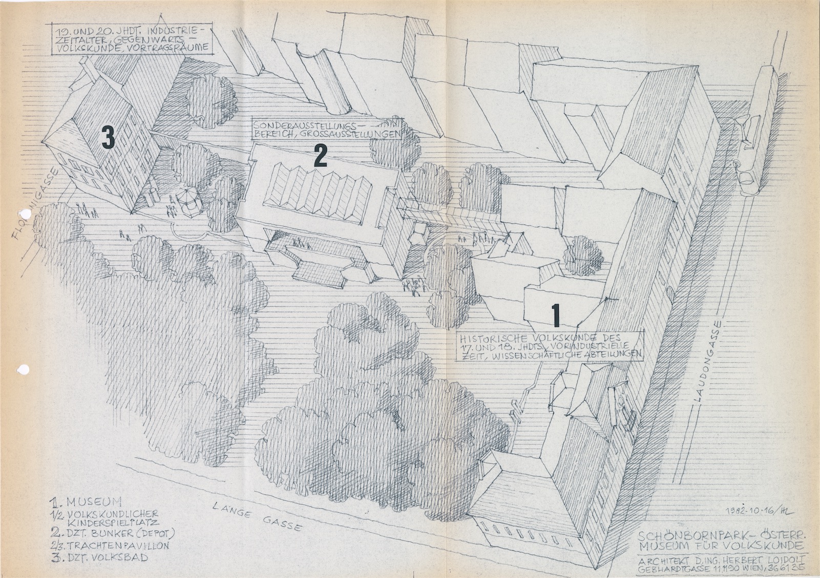 Das erste Konvolut zeigt die Pläne, die der Wiener Architekt Herbert Loidolt (Lebensdaten unbekannt) 1982 für das VKM gezeichnet hat. Loidolt hatte bereits 1980 Vorentwürfe erstellt. Er war, gemeinsam mit dem Architekten Rudolf Pamlitschka (1920–1999), auch für die Planungen der Restaurierung der gesamten Außenanlage des denkmalgeschützten Museumsgebäudes Gartenpalais Schönborn zuständig, die tatsächlich ab 1984 begann.