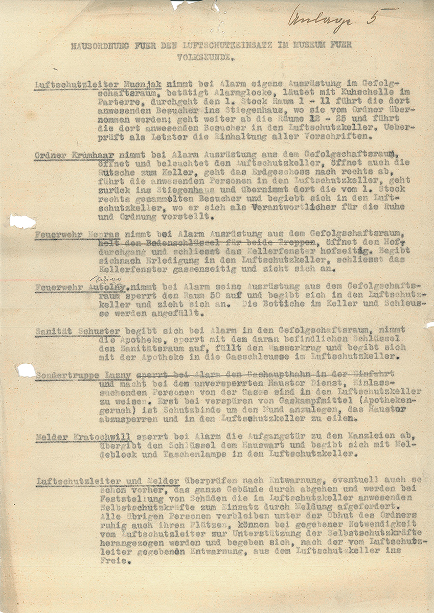 - Vgl. Schreiben der Polizeidienststelle Fuhrmanngasse ans Volkskundemuseum Wien vom 20. Februar 1940; Archivkarton Luftschutz, Archiv Volkskundemuseum Wien.